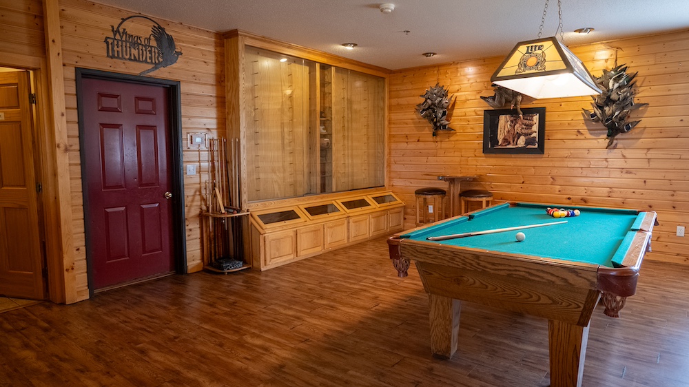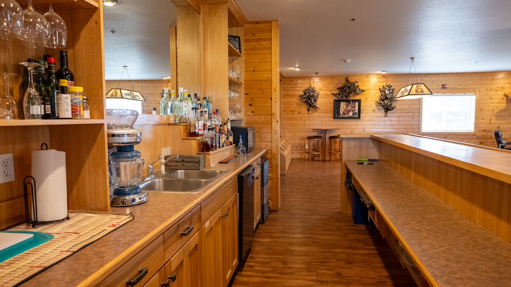 The bar and lounge area is the centerpiece of the lodge. Complete with a fireplace, handcrafted bar, and game tables, it provides a warm and social environment ideal for hosting clients or relaxing with family and friends. The open layout and quality finishes contribute to both comfort and efficiency of operation. A fire suppression system has been installed throughout the main structure for safety and compliance.