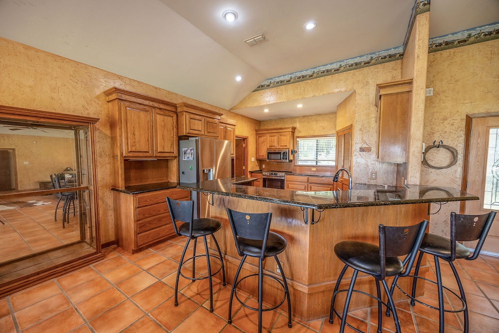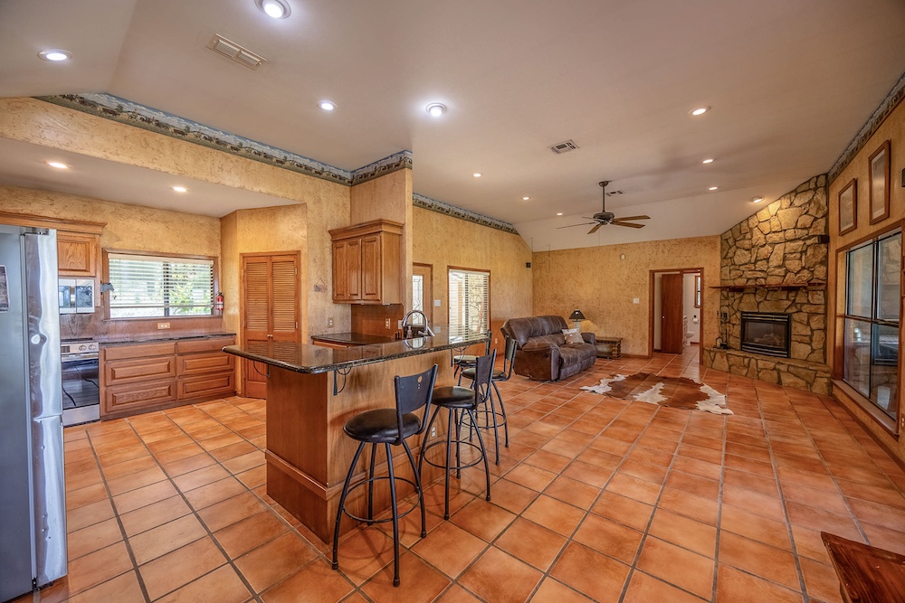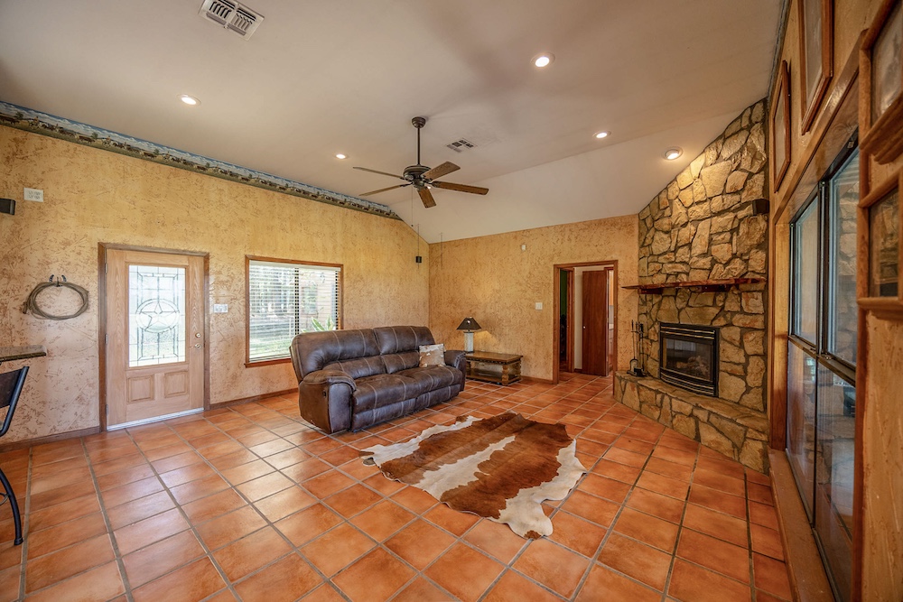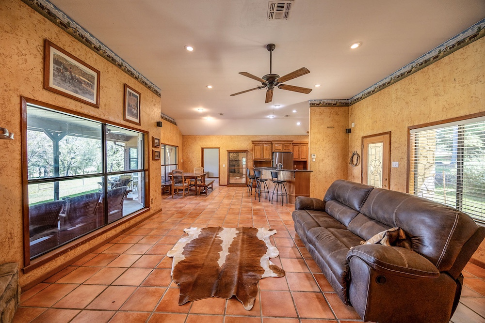 The home (per ACAD) provides approximately 1,965 sq ft of gross living area, with 3 bedrooms and 2 baths. It features a large open living/dining area adjoining a nicely appointed kitchen. An oversized attached two-car garage (with extra storage) adds functionality. Both front and rear covered patios extend the living space outdoors. Access is via a custom gravel drive, and a screen of mature trees provides privacy from the road while still framing expansive views of the ranch beyond.