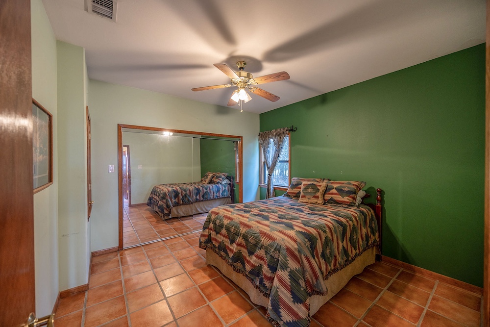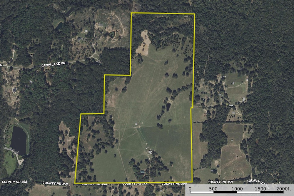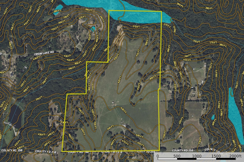Frontage along ACR 358 runs the full length of the southern boundary, ensuring good access. The land slopes generally downhill to the north, so the home (located near the higher elevations adjacent to the road) looks out over the tract, offering long views to the north from the rear patio. The extreme northern end transitions into denser timber and ultimately slopes toward a creek or drainage, giving a touch of bottomland character and habitat diversity.