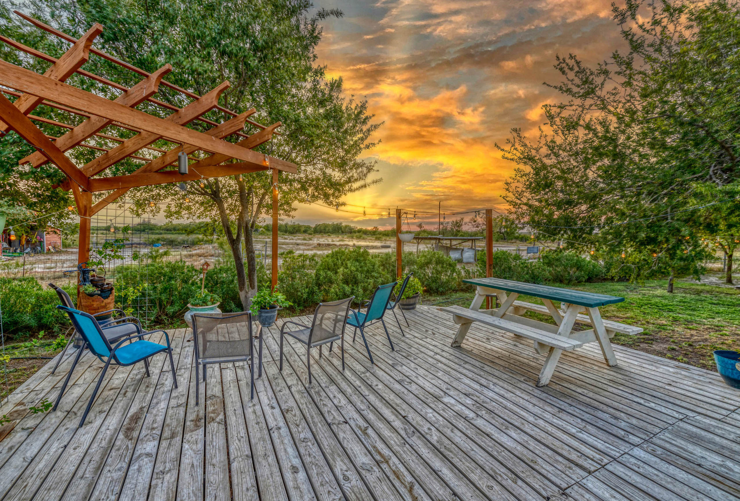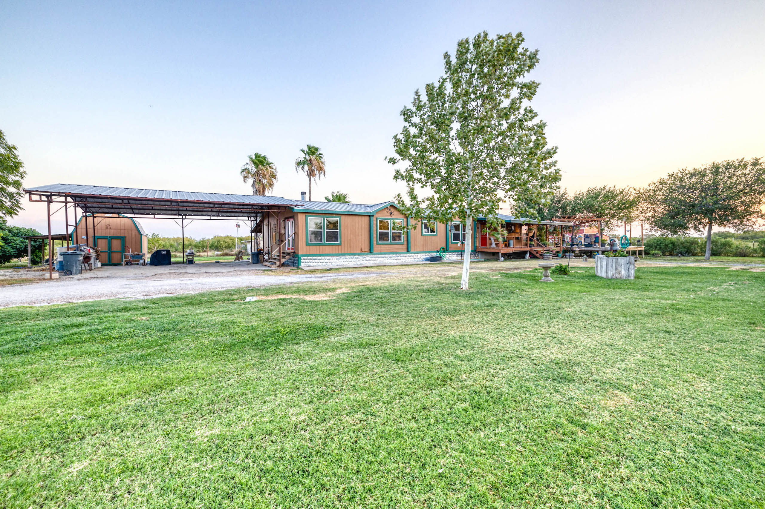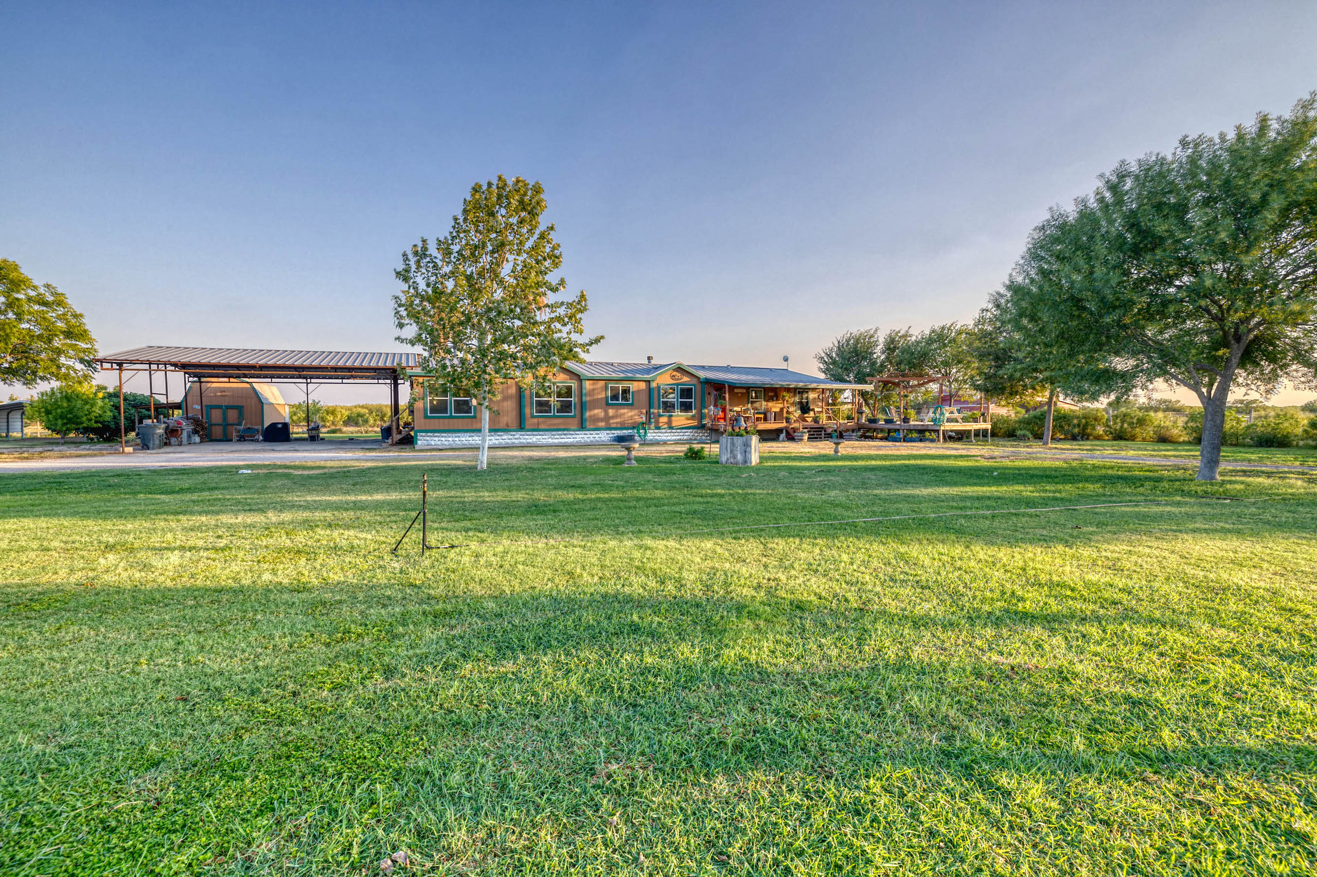 Improvements: A +/-2600 sf home with 5 bedrooms, 4 baths and a metal roof is full of upgrades and in excellent condition. There is also a 1 bedroom, 1 Ba room added on to the back of the house for guests to have their own privacy. Both the front and back porches are covered and there is a separate deck and pergola for outdoor BBQ. Extending from the house is a large metal-covered area for parking multiple vehicles. A nice +/- 2200 sf metal barn provides plenty of storage room and protection for equipment. Electricity runs from the front gate and down most of the north property line providing multiple options for additional power needs. There is a meter at the front gate and a second meter at the house. In addition, there is an RV hook-up near the house.