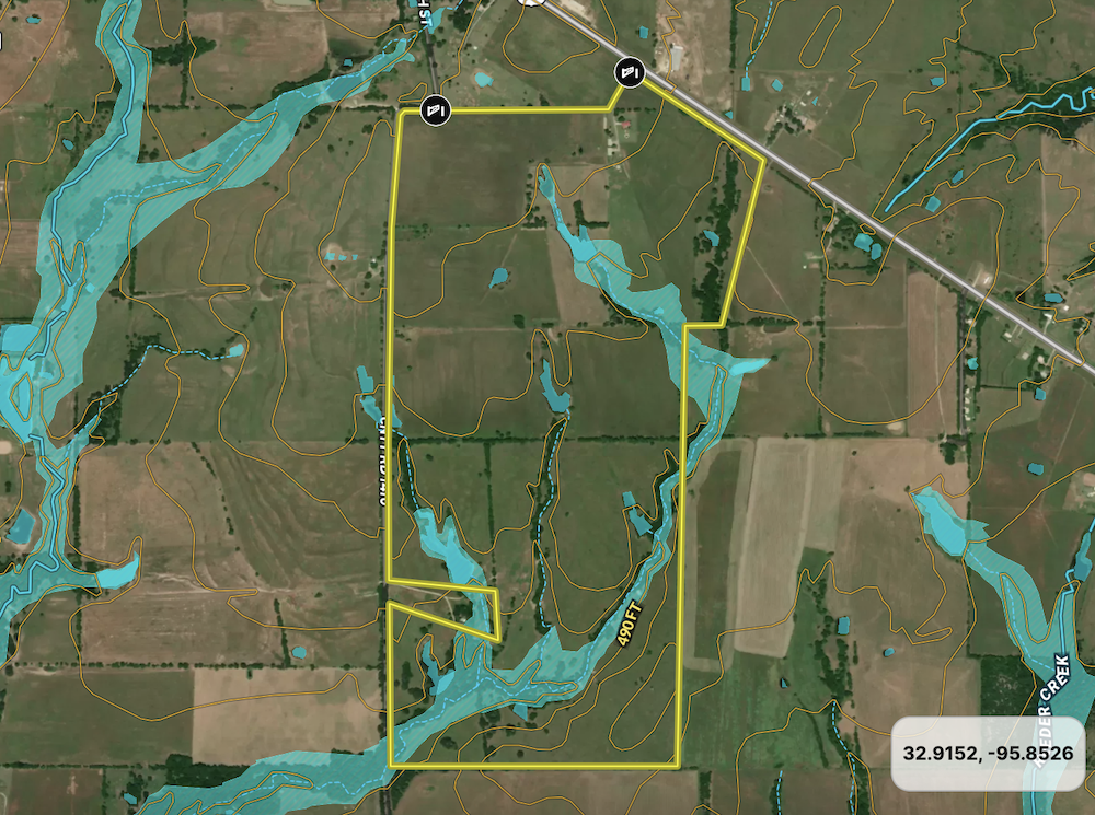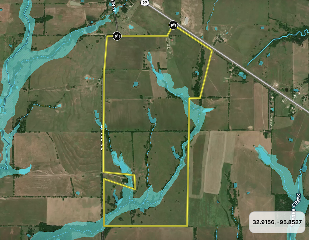 With frontage along Highway 69 as well as county road frontage spanning the entire west boundary, the property is well-positioned for potential subdivision and development. The land is predominantly flat and usable, featuring multiple large ponds, minimal floodplain, and a configuration that would allow for efficient division while maximizing overall use.