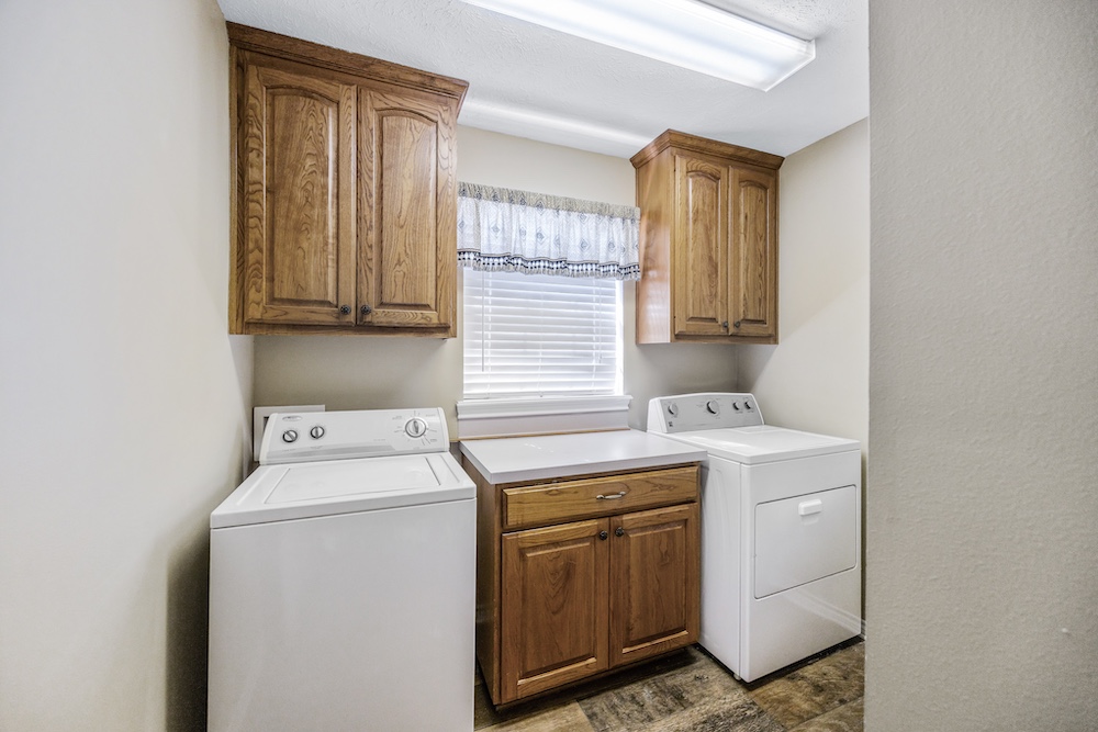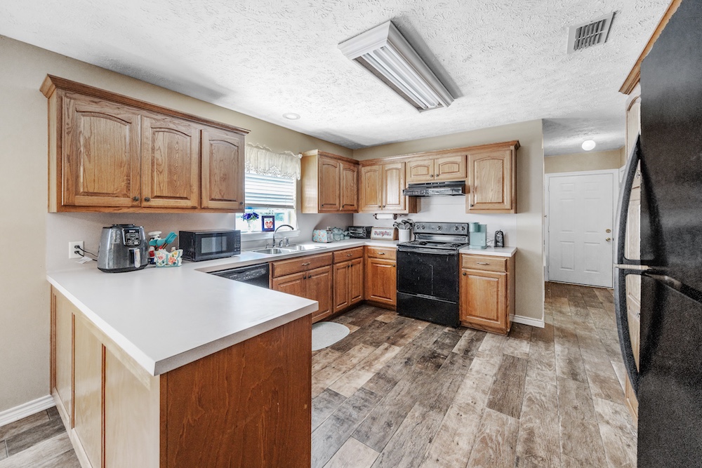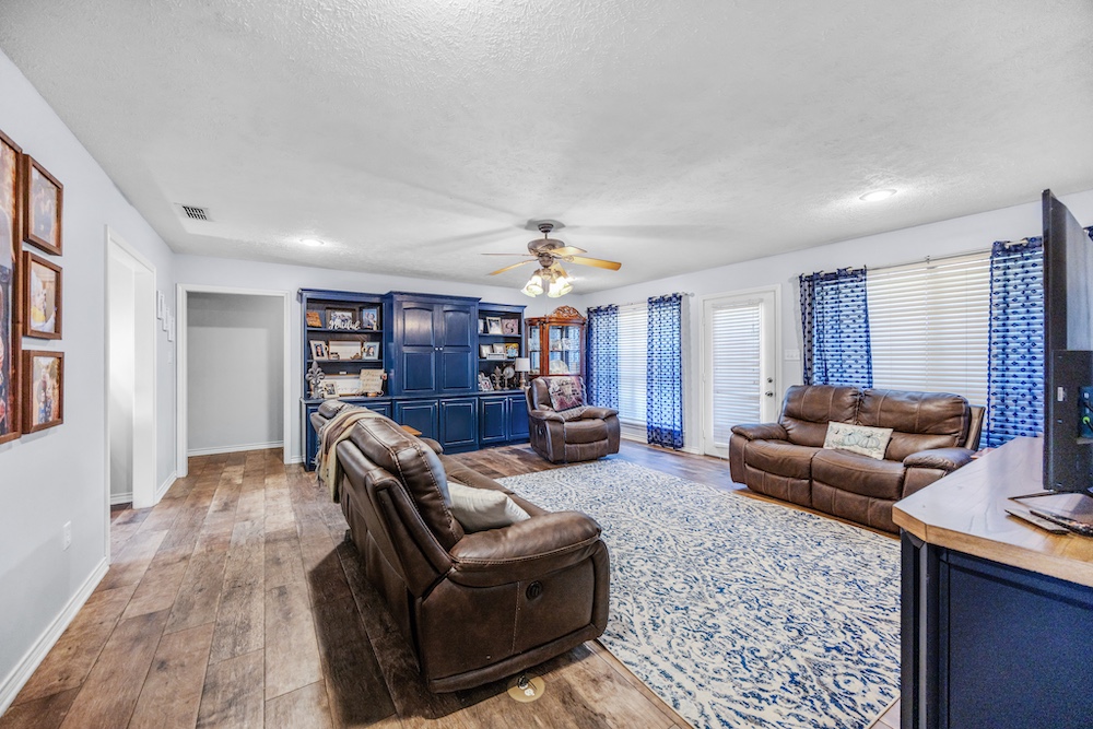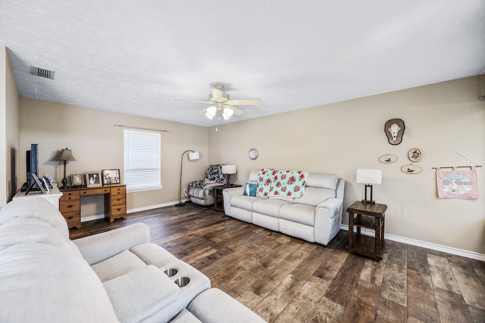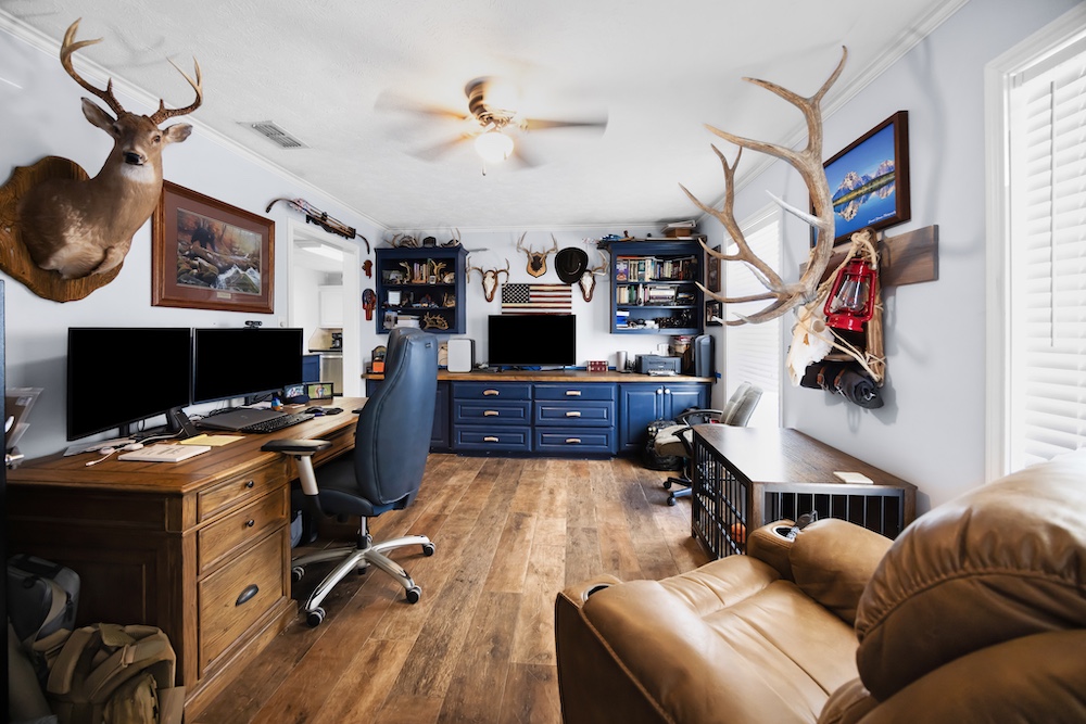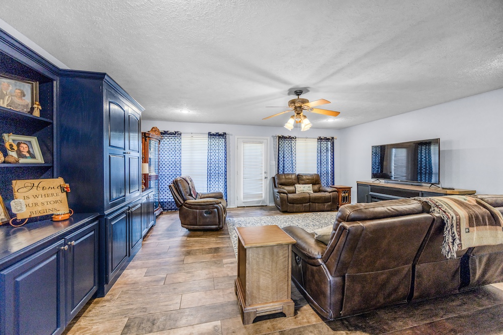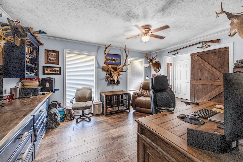 The main home, built in 2001, features 2,645± square feet with 4 bedrooms, 2.5 baths, a spacious office with built-ins, and a warm rustic feel throughout. The kitchen has an island and plenty of storage, opening to a cozy living space perfect for family gatherings. The primary suite includes a large walk-in closet and updated floors, while the covered back porch makes for great morning coffee spots with peaceful country views.