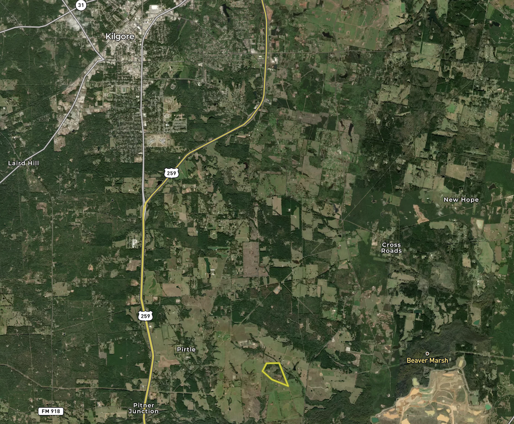 Nearby towns include Kilgore (11 mi), Henderson (11 mi), Longview (18 mi), and Tyler (35 mi).