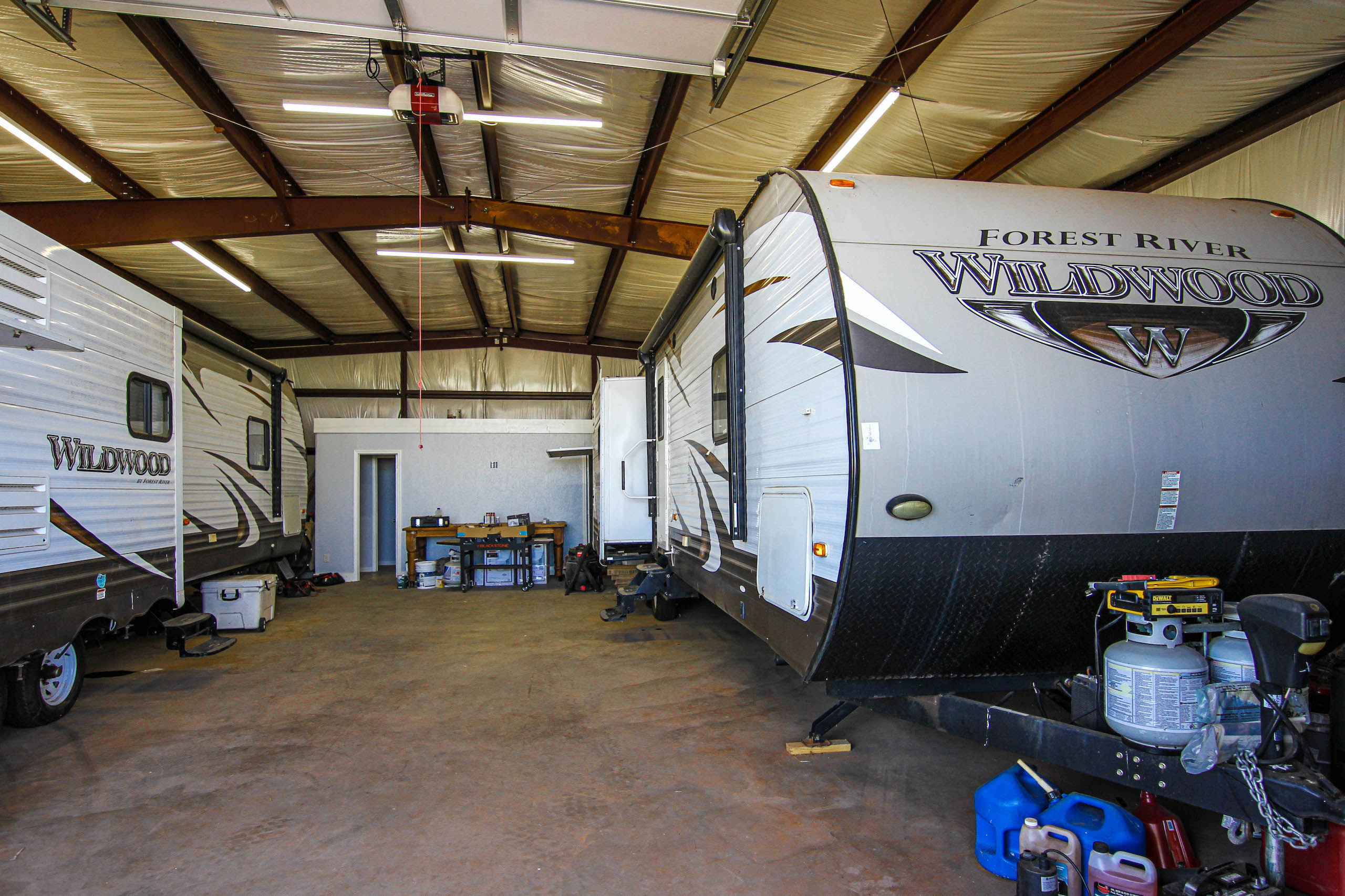 When you are done for the day you can retire to the camp area, where you will find a 2,000-square-foot insulated metal barn that is set up for putting a couple of RV campers inside. This provides a sheltered spot for your campers and allows easy hookups to the electricity, septic, and water systems. RVs currently on the property are NOT included in the sale. There is also a newly constructed Jack-and-Jill bathroom in the barn, providing two vanity/toilet rooms and a shared shower room. Water is provided by a 2,500-gallon storage tank that the seller has the local fire department fill on an as-needed basis.
