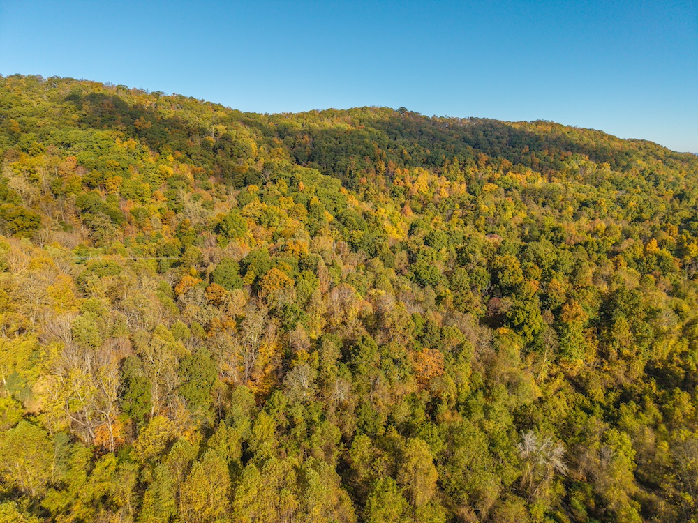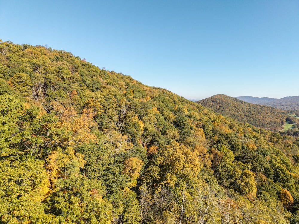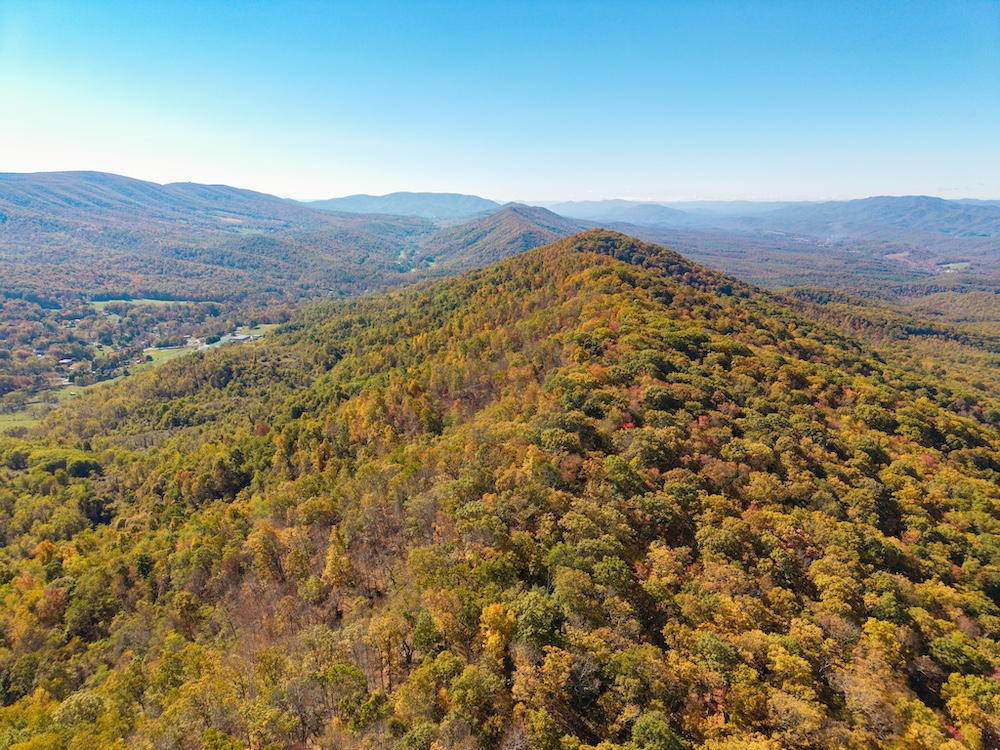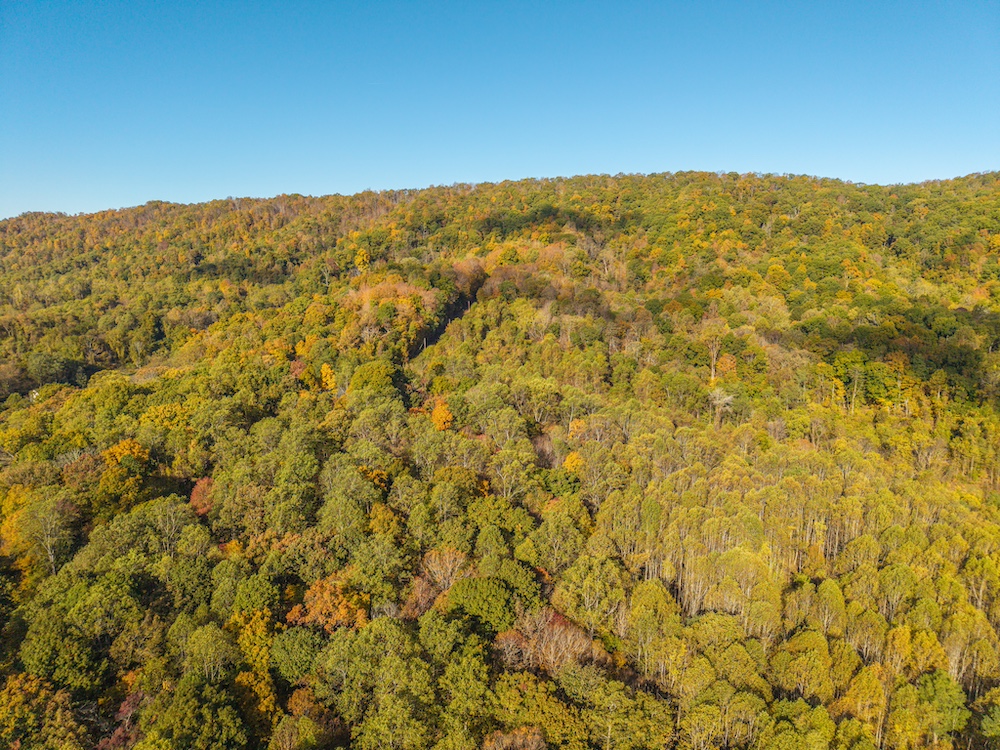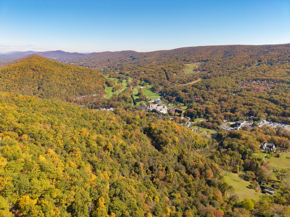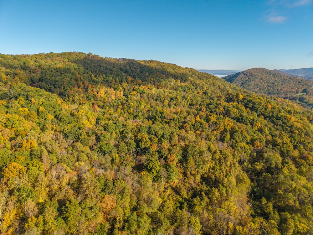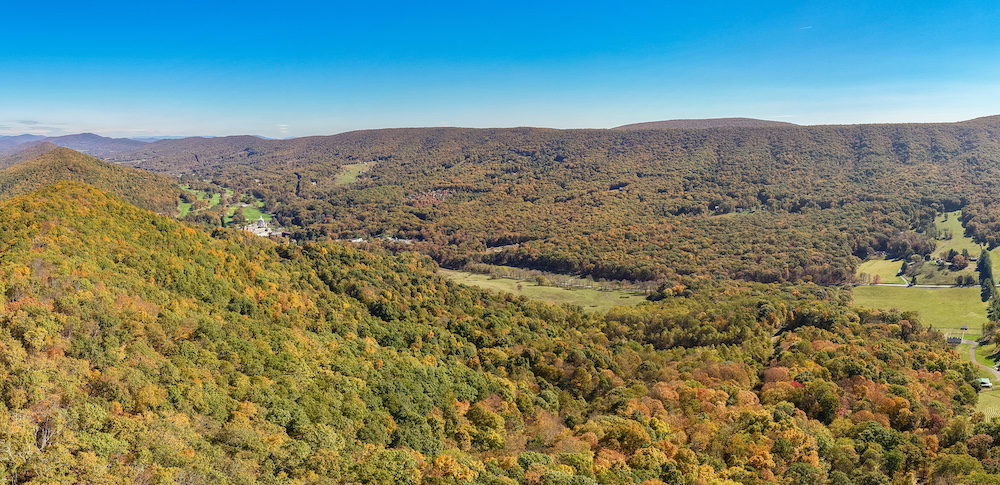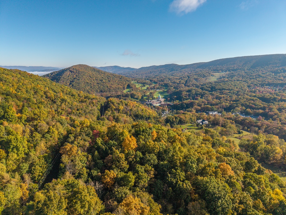 Miles of well-established roads and trails wind through mature hardwood forests, providing excellent access throughout the property for hiking, horseback riding, or ATV adventures. The mountain peak offers commanding 360-degree views of the surrounding valleys, the Allegheny Mountains, and the historic Omni Homestead Resort below — an extraordinary vantage point rarely available.